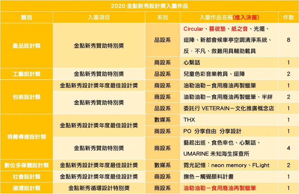為提倡「循環設計」從原料、設計、製造、銷售、使用、回收及再利用的環境永續概念,今年金點新秀設計獎與永續循環經濟發展協進會合作增設「金點新秀循環設計特別獎」,有56件作品進入決審,其中,銘傳商設系曾宏宇、孫子婷、郭靜、陳盈蓁等4位學生作品「油勒油勒-食用廢油再製蠟筆」,將家中的食用性廢油回收再製成蠟筆,提倡環保再利用與宣導正確的廢油處理觀念,一舉通過「循環設計特別獎」複審進入決審,並入圍包裝設計類「金點新秀年度最佳設計獎」、「金點新秀贊助特別獎」3個項目。